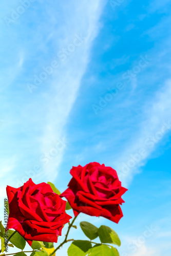 Red rose flower and blue sky background.