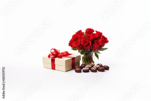 Red roses and chololates on a white background. Valentines day, anniversary, mothers day, etc.