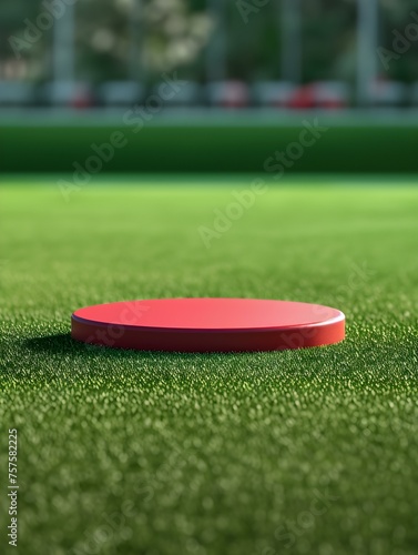 Red round Platform for Product Presentation on a green Pitch. Blurred Sports Background