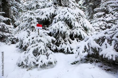 Red Santa Claus hat on the fir tree in winter forest. Christmas background.