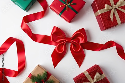 Red Satin Ribbon Bow on White Background Perfect for Holiday Gift Wrapping