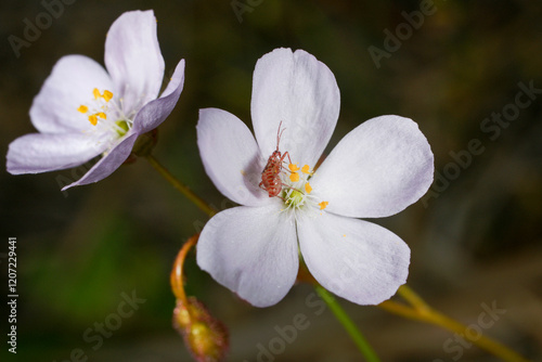 Red Setocoris bug living in symbiosis on the white sundew flower of Drosera andersoniana, natural habitat, Western Australia