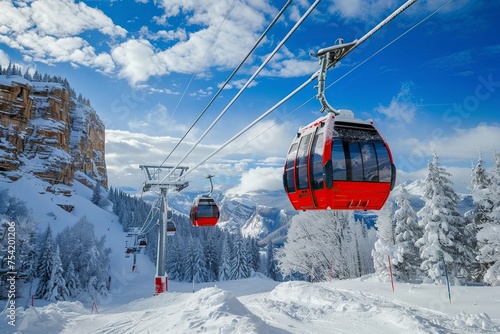 Red Ski Lift Ascending Snowy Mountain