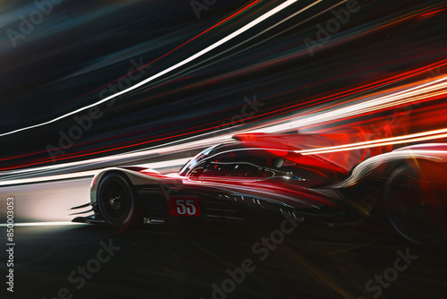 Red sports car driving fast on a track with motion blur for speed and racing