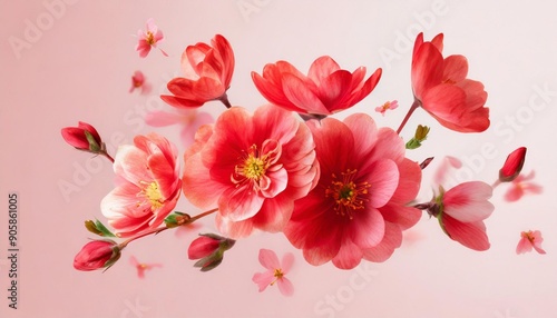Red spring flowers flying on a transparent background. Beautiful pastel pink flower arrangement. Summer aesthetic concept.