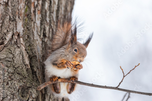 Red squirrel sitting on a tree branch in winter forest and nibbling seeds on snow covered trees background..