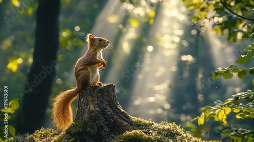 Red squirrel, sunlit forest, tree stump, alert, nature