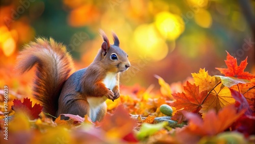 Red squirrel surrounded by colorful autumn leaves in the forest, squirrel, red, autumn, forest, leaves, nature, wildlife