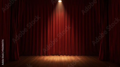 Red stage curtain closed. Spotlight illuminates empty stage.