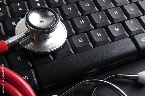 Red stethoscope,keyboard ,puzzle and coins. Medical concept.