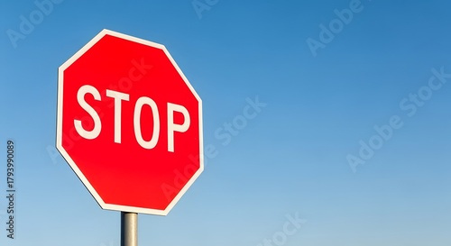 Red stop sign against clear blue sky for traffic safety awareness and road transportation design