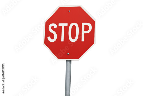 Red stop sign on pole with stop text, indicating road safety and traffic control, transparent background