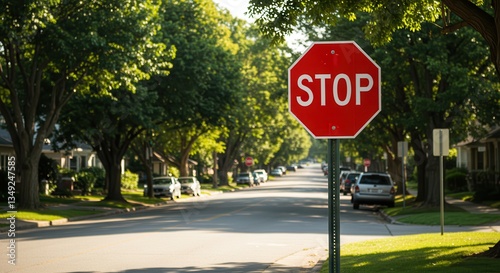 Red Stop Sign on Suburban Street with Green Trees Lining Road