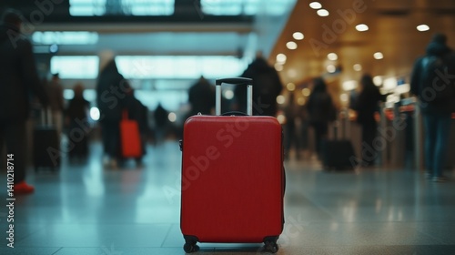 Red suitcase in busy airport terminal with travelers and check-in counters in background.
