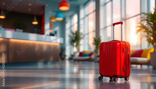 Red Suitcase in Hotel Lobby: Awaiting Vacation Adventures