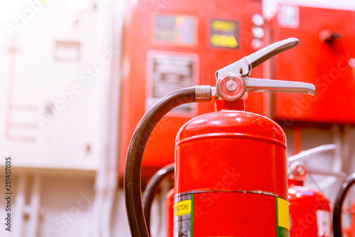 Red tank of fire extinguisher Overview of a powerful industrial fire extinguishing system.