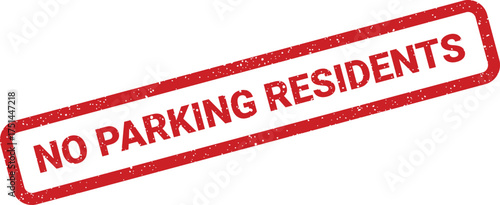 Red textured stamp vector featuring the strong message NO PARKING RESIDENTS diagonally inside its rectangular frame