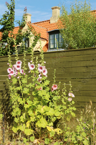 Red tiled roofs of the house, chimneys, a high wooden fence, blooming pink common hollyhock, on the street in a small Danish town.