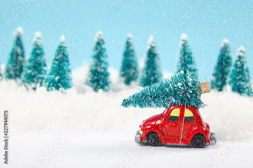 Red toy car carrying a Christmas tree through the forest in snowfall. Cristmas and new year background.