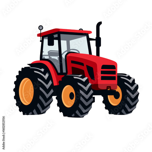 Red tractor illustration, agricultural machinery for farming and cultivation.