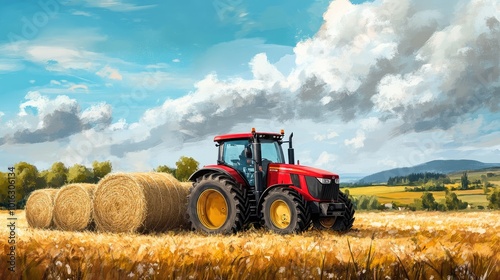 Red tractor with hay bales in tow, against a scenic countryside landscape.