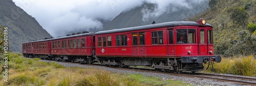 Red train travels scenic mountain pass. Travel poster