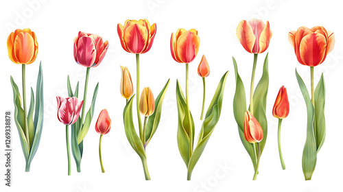 Red tulip flowers paint collection. Set of spring and summer flowers painting isolated on white background