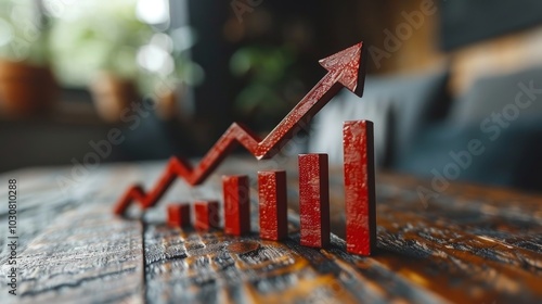 Red Upward Arrow And Bar Graph Symbolizing Growth And Success On Rustic Wooden Table Background