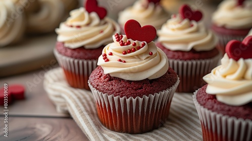 Red velvet cupcakes with cream cheese frosting and heart-shaped topper. Valentine's Day treat concept for design and print.