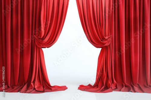 Red velvet curtains on white background create dramatic setting for theater performance. Elegant, stylish, perfect for film, opera, or concert. Curtain decor with many folds, isolated on plain white