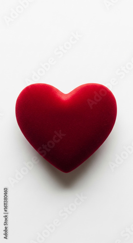 Red velvet heart on white background, symbolizing love and Valentine's Day, perfect for greeting card or romantic design