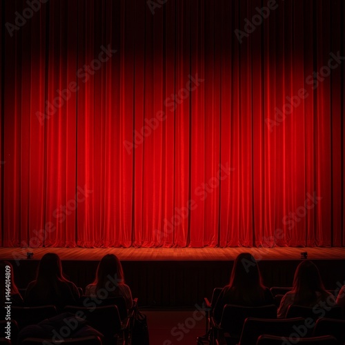 Red Velvet Theater Curtain Before a Show with Audience in Dark Room