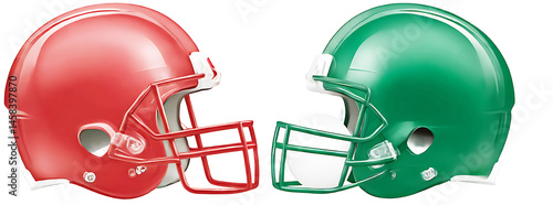 Red versus green american football helmets facing each other sports equipment head protection gear game day on white background