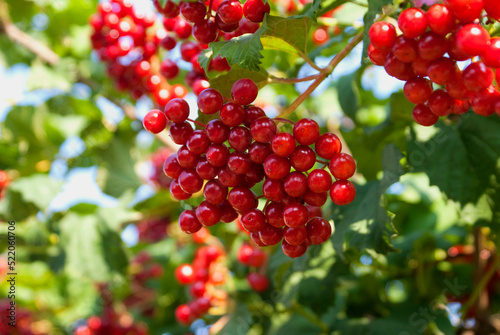 Red viburnum berries with green leaves on a bush on a summer sunny day
