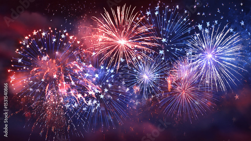 Red, White, and Blue Fireworks with Glowing Star Trails – Patriotic Night Sky Background for 4th of July Celebrations