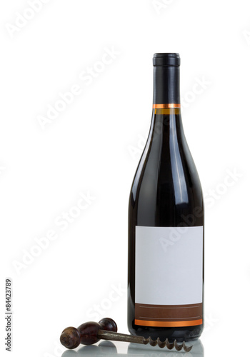 Red Wine bottle and antique corkscrew isolated on white backgrou