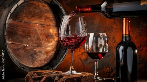 Red Wine Pouring into Glass with Barrel, Wine, Cellar, Drink, Beverage