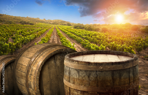 Red wine with barrel on vineyard in green Tuscany, Italy
