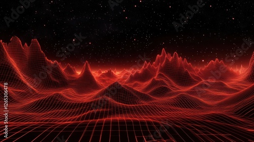 Red wireframe landscape, night sky, digital art, gaming