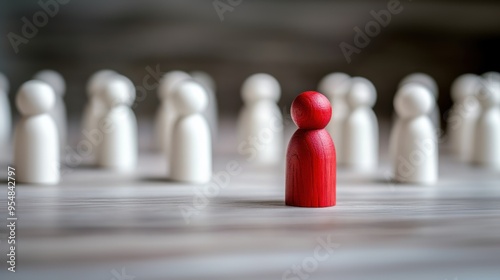 Red wooden figure standing out among white ones on the table, highlighting the best job candidate, visual emphasis, unique selection