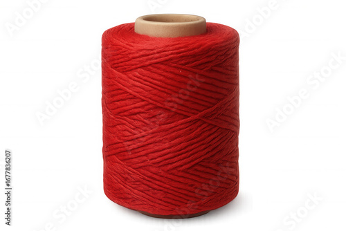 Red yarn coiling cardboard tube, transparent backdrop highlighting textile crafting potential