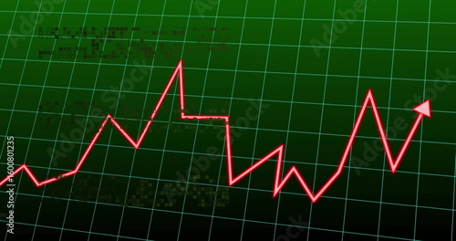 Red zigzag graph with glowing arrowhead moving across green grid on screen, showing data symbols