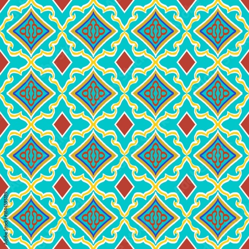 Red-blue-yellow diamond textile with cultural motifs, blending elegance and tradition.