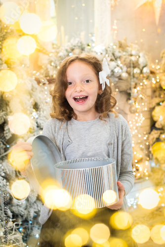 red-haired girl opens a gift near the Christmas tree. smiles, garland, lights, festive, new year