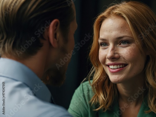 Red-haired woman warmly smiling at a man during a friendly indoor conversation.