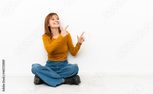 Redhead girl sitting on the floor isolated on white background pointing with the index finger a great idea