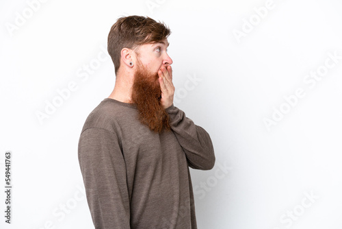 Redhead man with beard isolated on white background doing surprise gesture while looking to the side