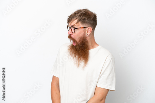Redhead man with long beard isolated on white background doing surprise gesture while looking to the side