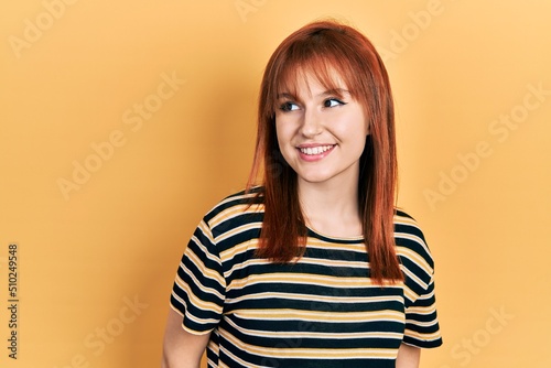 Redhead young woman wearing casual striped t shirt looking to side, relax profile pose with natural face and confident smile.