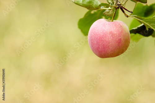 Red-ripe apple hanging alone on a branch. Blurred green background
